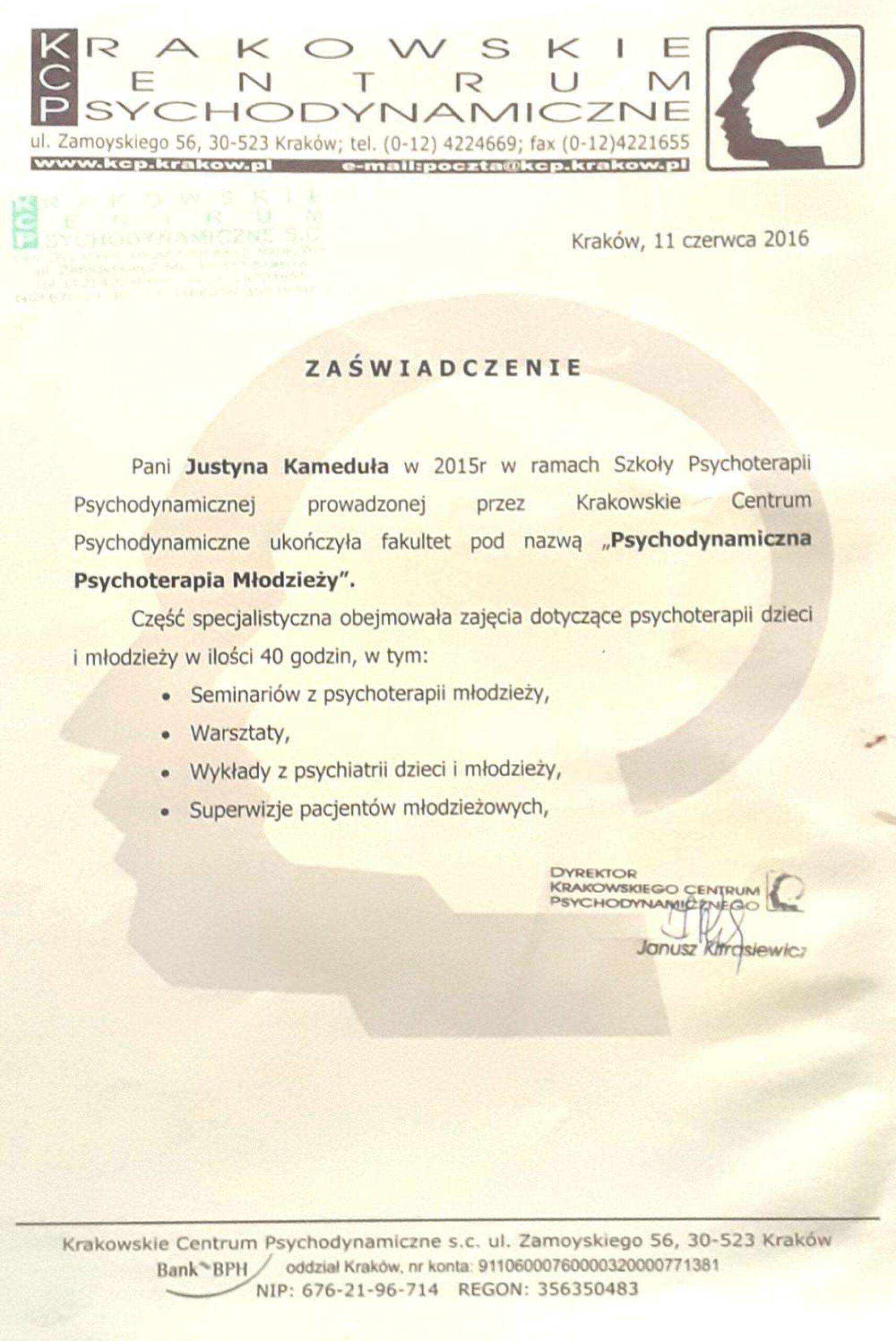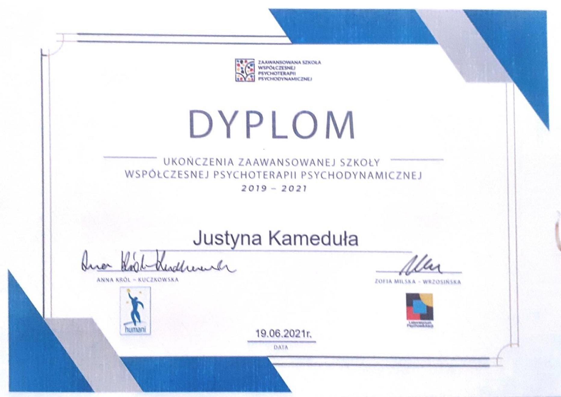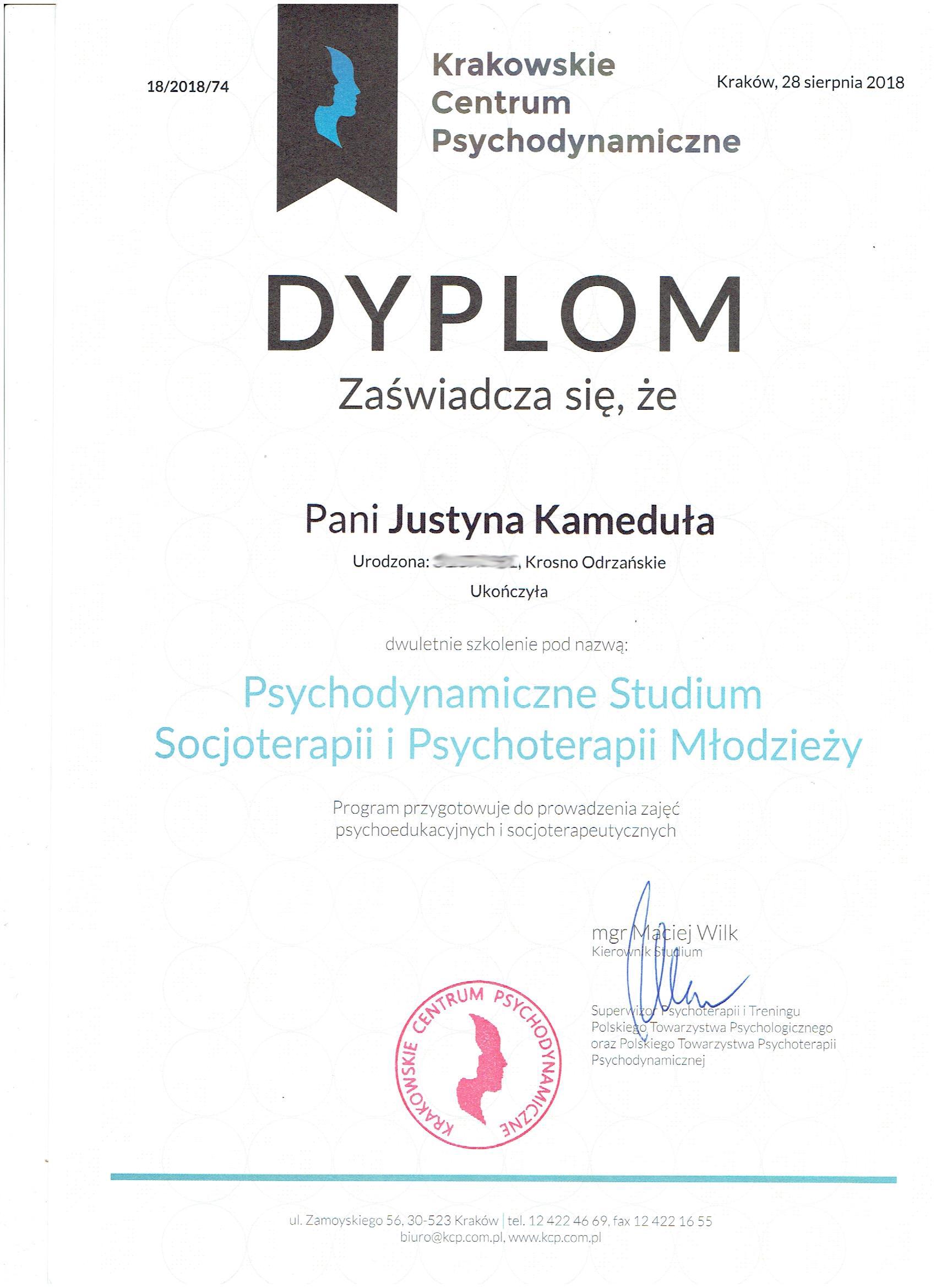 Psychoterapeutka, absolwentka Podstaw Psychoterapii Psychodynamicznej w Krakowskim Centrum Psychodynamicznym rekomendowanym przez Polskie Towarzystwo Psychologiczne. Swój warsztat terapeutyczny rozwijam w Krakowskim Centrum Psychodynamicznym. Ukończyłam Psychodynamiczne Studium Socjoterapii i Psychoterapii Młodzieży w Poznaniu, a także szkolenie z Psychotraumatologii Praktycznej organizowane przez Fundację PCP, dające uprawnienia do pracy w zakresie psychotraumatologii i interwencji kryzysowej. Pracuje z osobami w sytuacji kryzysu, z problemami emocjonalnymi, trudnościami w relacjach, z zaburzeniami lękowymi i depresyjnymi, z zaburzeniami osobowości. Prowadzi psychoterapię par i małżeństw w kryzysie oraz psychoterapię indywidualną osób dorosłych i młodzieży. Regularnie poddaje swoją pracę superwizji u certyfikowanych superwizorów. Systematycznie doskonalę swoje umiejętności zawodowe, biorąc udział w licznych konferencjach i szkoleniach. W swojej pracy przestrzegam zasad Kodeksu Etycznego Psychoterapeuty Psychodynamicznego i Kodeksu Etyczno-Zawodowego Psychologa.