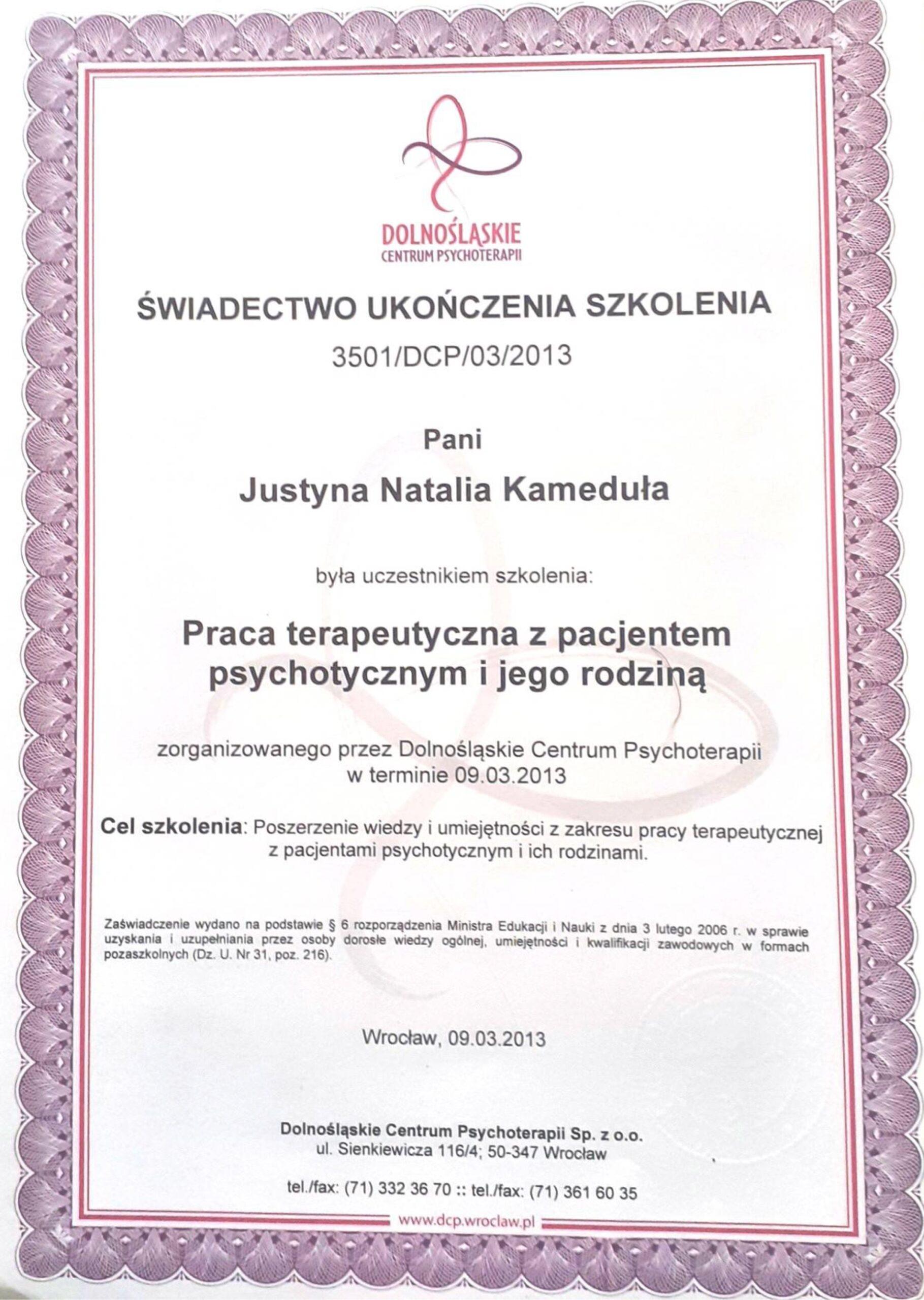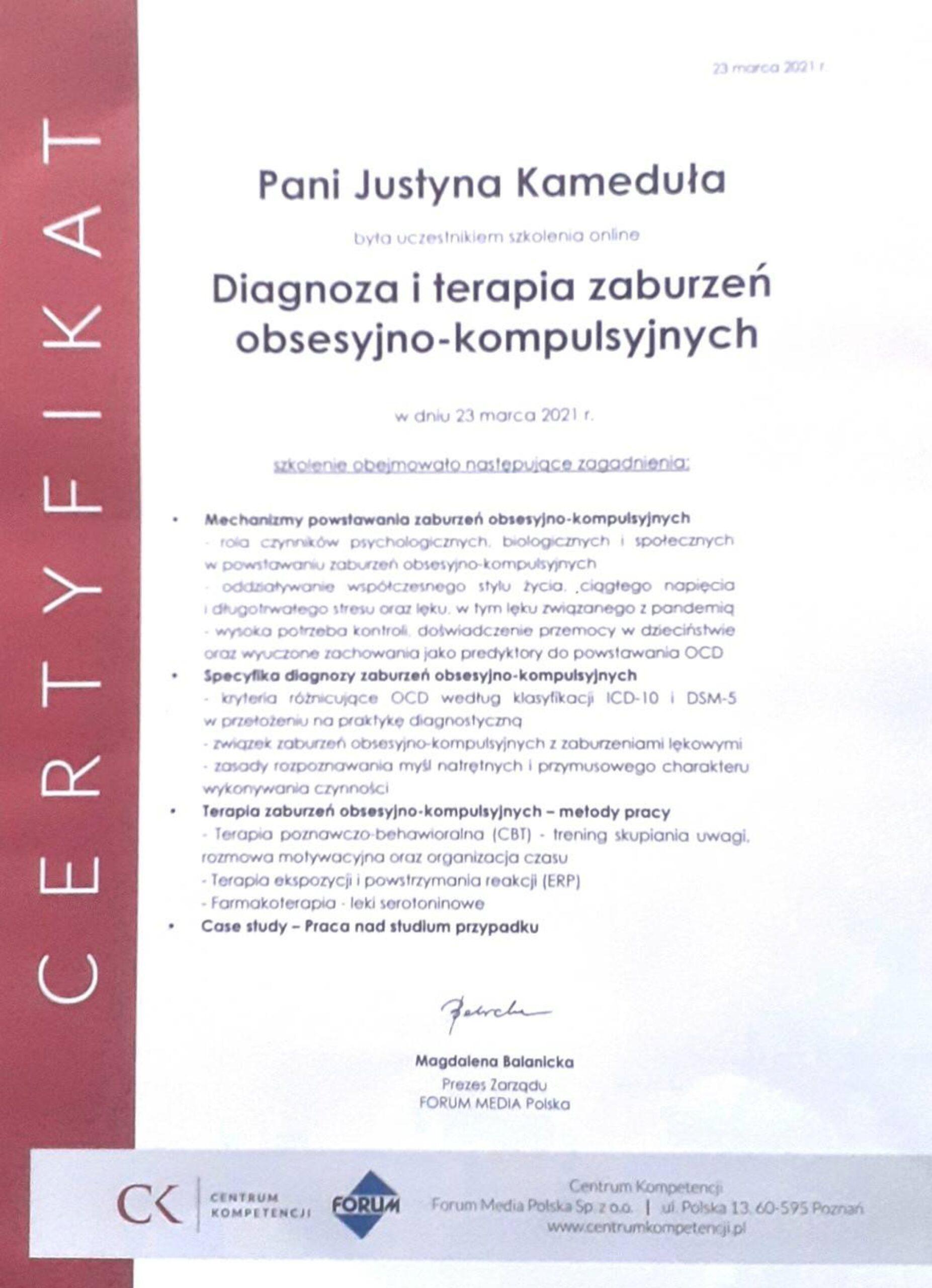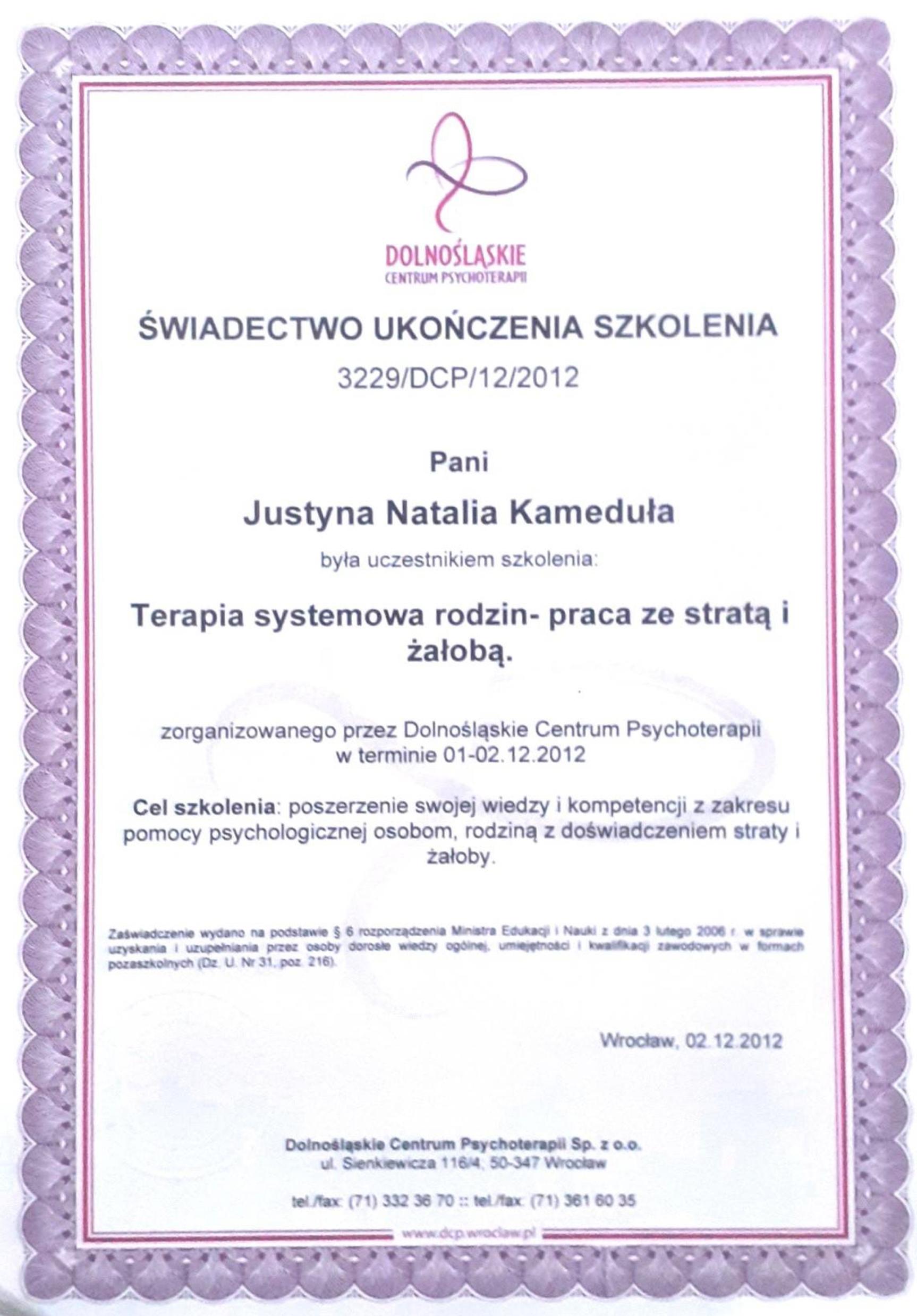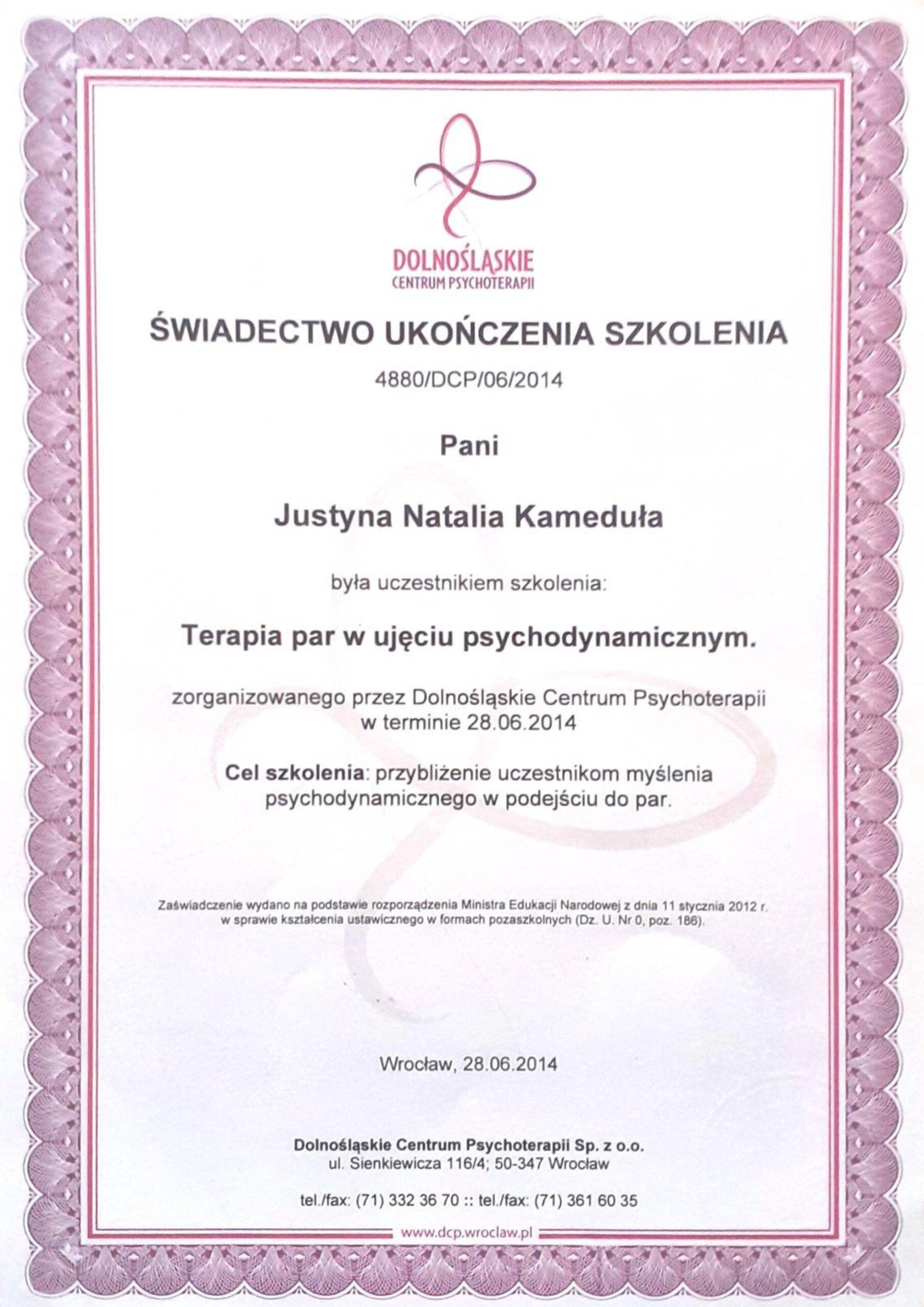 Psychoterapeutka, absolwentka Podstaw Psychoterapii Psychodynamicznej w Krakowskim Centrum Psychodynamicznym rekomendowanym przez Polskie Towarzystwo Psychologiczne. Swój warsztat terapeutyczny rozwijam w Krakowskim Centrum Psychodynamicznym. Ukończyłam Psychodynamiczne Studium Socjoterapii i Psychoterapii Młodzieży w Poznaniu, a także szkolenie z Psychotraumatologii Praktycznej organizowane przez Fundację PCP, dające uprawnienia do pracy w zakresie psychotraumatologii i interwencji kryzysowej. Pracuje z osobami w sytuacji kryzysu, z problemami emocjonalnymi, trudnościami w relacjach, z zaburzeniami lękowymi i depresyjnymi, z zaburzeniami osobowości. Prowadzi psychoterapię par i małżeństw w kryzysie oraz psychoterapię indywidualną osób dorosłych i młodzieży. Regularnie poddaje swoją pracę superwizji u certyfikowanych superwizorów. Systematycznie doskonalę swoje umiejętności zawodowe, biorąc udział w licznych konferencjach i szkoleniach. W swojej pracy przestrzegam zasad Kodeksu Etycznego Psychoterapeuty Psychodynamicznego i Kodeksu Etyczno-Zawodowego Psychologa.