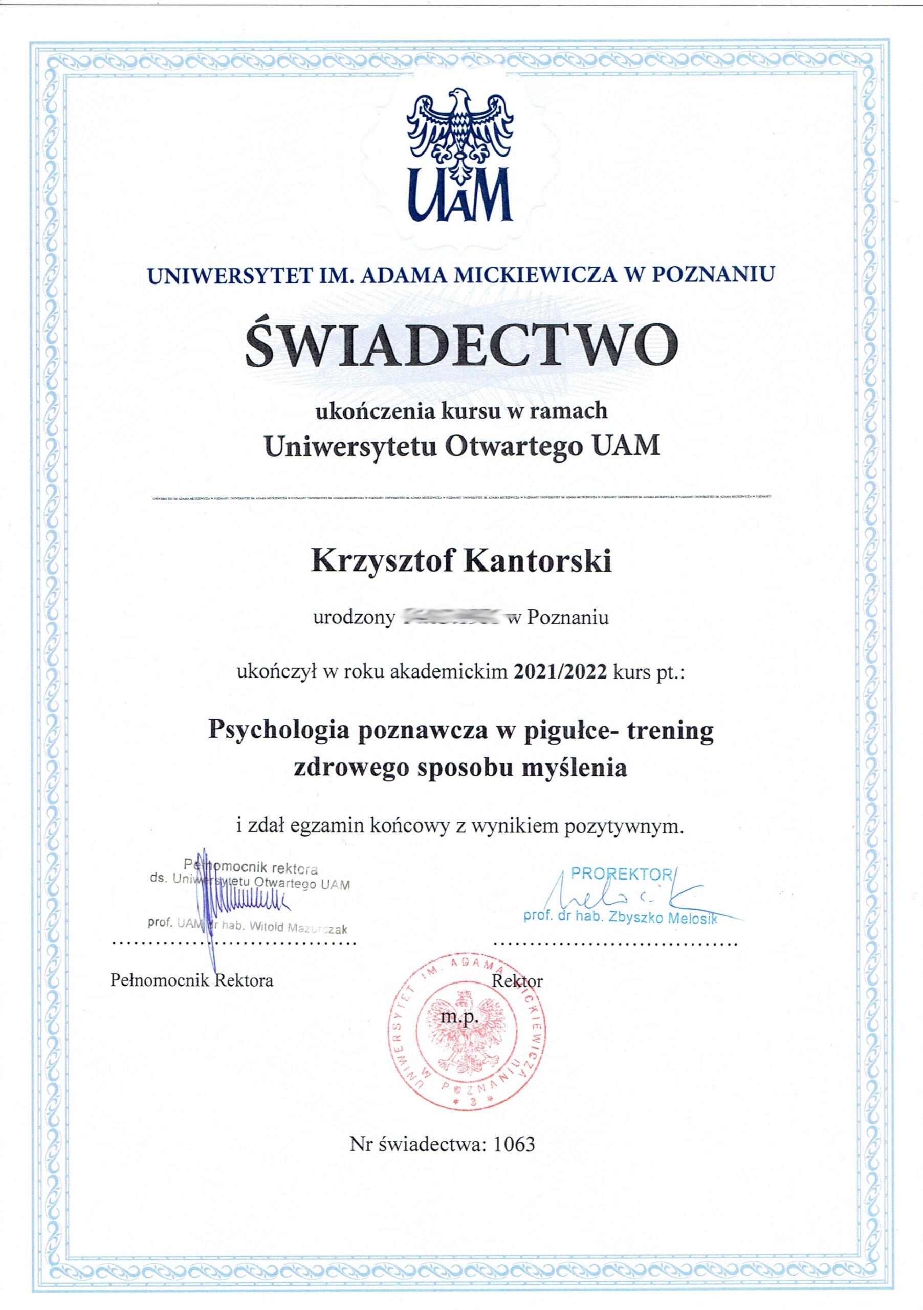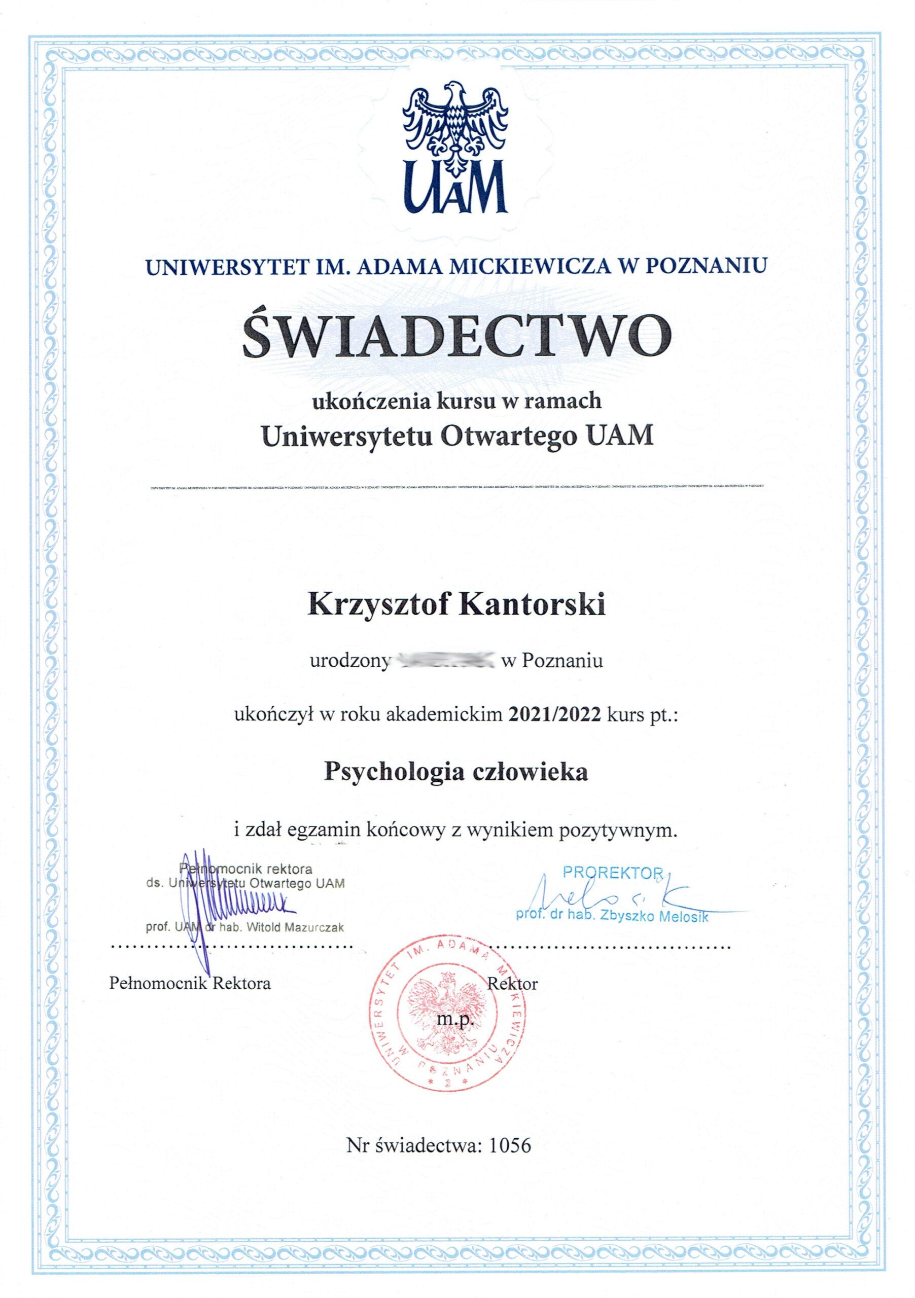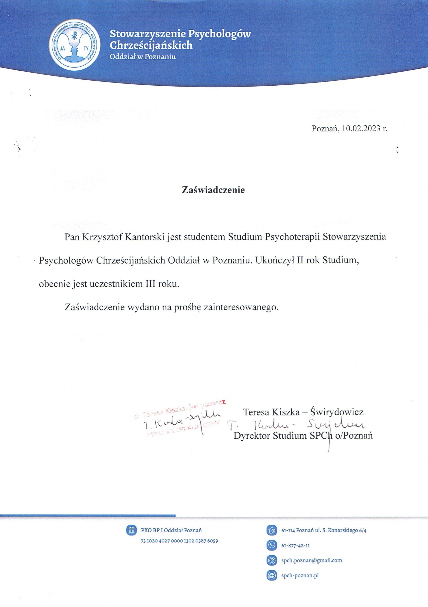 Jestem po drugim roku Studium Psychoterapii w (SPCh), co daje mi niezbędną wiedzę i umiejętności do prowadzenia psychoterapii osób dorosłych i par. Współprowadzę również szkolenia i warsztaty z empatycznej komunikacji (opartej o zasady Porozumienia bez przemocy) jako trener. Doświadczenie w pracy z parami zdobywałem również w Polskim Centrum Mediacji — Oddział w poznaniu spotykając się z parami w tzw. Fyrtlu Zgody przy Sądzie Rejonowym w Poznaniu w latach 2016-2017. Prowadziłem wykłady i warsztaty z zakresu rozwoju osobistego i pogłębiania samoświadomości w ramach Akademii miłości dla Singli w Poznaniu, Lesznie i Szczecinie, a także Warsztaty z komunikacji dla Zachodniopomorskiego Uniwersytetu Technologicznego w Szczecinie. Ponieważ każdy człowiek jest inny i potrzebuje czegoś innego, nie przywiązuję się do określonego nurtu psychoterapeutycznego, lecz dostosowuję go do potrzeb pacjenta. Regularnie korzystam z superwizji i jestem w trakcie terapii własnej.